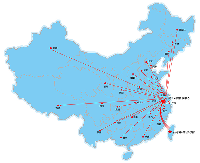 昆山嘉尼赫機(jī)械有限公司為臺灣鍵和機(jī)械股份有限公司在大陸設(shè)定的唯一子公司,本公司于2010年4月在昆山仕泰隆模具城成立,應(yīng)市場需求于2015年2月搬遷至昆山周市鎮(zhèn)成立鍵和中國售服中心。設(shè)有獨(dú)立的零配件倉庫及機(jī)臺大修車間,機(jī)臺樣機(jī)展示廳。